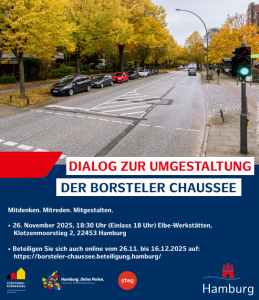 Die Pläne, die dem Stadtteilbeirat auf der Sitzung am 23.06.22 vorgestellt wurden, sind nun online. Klicken Sie dazu einfach hier. Ergänzt werden diese durch die textliche Beschreibung zur Machbarkeitsstudie. Diese finden Sie hier. Um zu einer kurzen Begriffserläuterung bei der Verkehrsplanung zu gelangen (herausgegeben vom LSBG), klicken Sie hier.