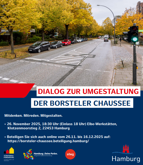 Die Ergebnisse der Beteiligungsveranstaltung vom 26. November sowie der digitalen Beteiligung werden auf der Webseite https://borsteler-chaussee.beteiligung.hamburg/ sowie hier veröffentlicht. Im Frühjahr 2026 ist eine weitere Vor-Ort-Veranstaltung im Stadtteil geplant, gefolgt von einer Beteiligung zur konkreten Gestaltung der Frei- und Grünflächen.